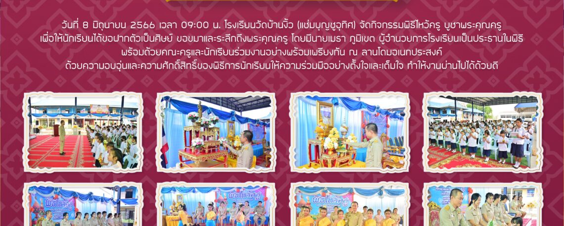 วันที่ 8 มิถุนายน 2566 เวลา 09.00 น. โรงเรียนวัดบ้านงิ้ว(แช่มบุญชูอุทิศ) จัดกิจกรรมพิธีไหว้ครู บูชาพระคุณครู เพื่อให้นักเรียนได้ขอฝากตัวเป็นศิษย์ขอขมาและระลึกถึงพระคุณครู โดยมีนายเมธา ภูมิเขต ผู้อำนวยการโรงเรียนเป็นประธานในพิธี พร้อมด้วยคณะครูและนักเรียนร่วมงานอย่างพร้อมเพรียงกัน ณ ลานโดมอเนกประสงค์ ด้วยความอบอุ่นและความศักดิ์สิทธิ์ของพิธีการนักเรียนให้ความร่วมมืออย่างตั้งใจและเต็มใจ ทำให้งานผ่านไปด้วยดี