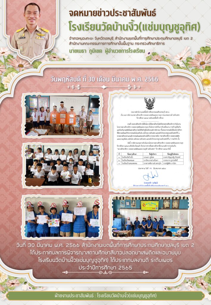 โรงเรียนวัดบ้านงิ้ว(แช่มบุญชูอุทิศ) ได้รับพิจารณาสถานศึกษาสีขาวปลอดยาเสพติดและอบายมุข ประเภทผลงานดี ระดับเพชร ปีการศึกษา 2565 30 มี.ค.,2023 adminใส่ความเห็น Post Views: 178